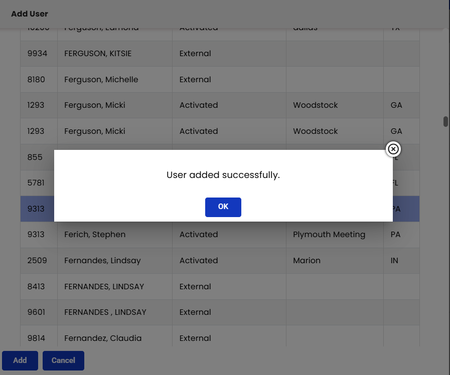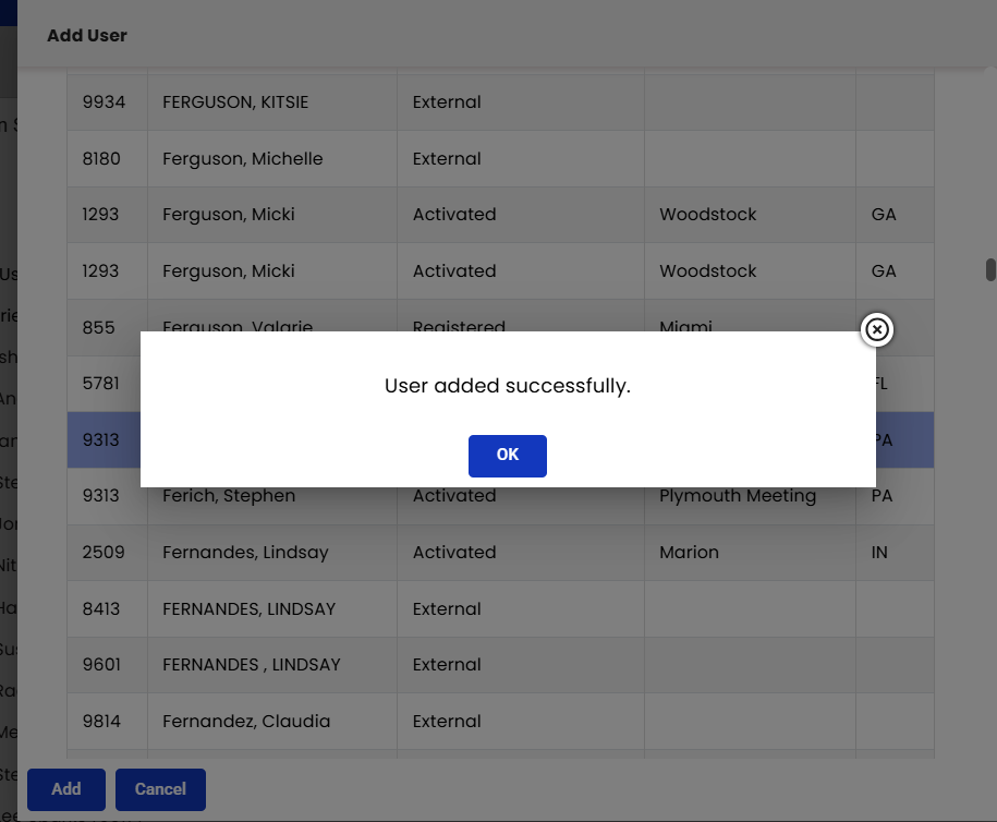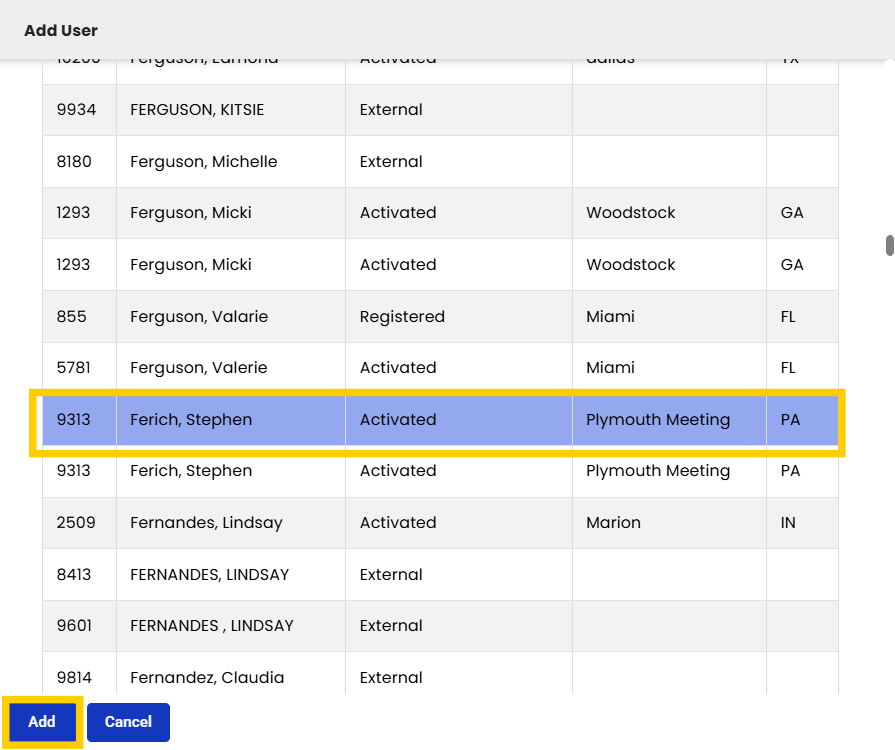 Once you have located the user, click Add.